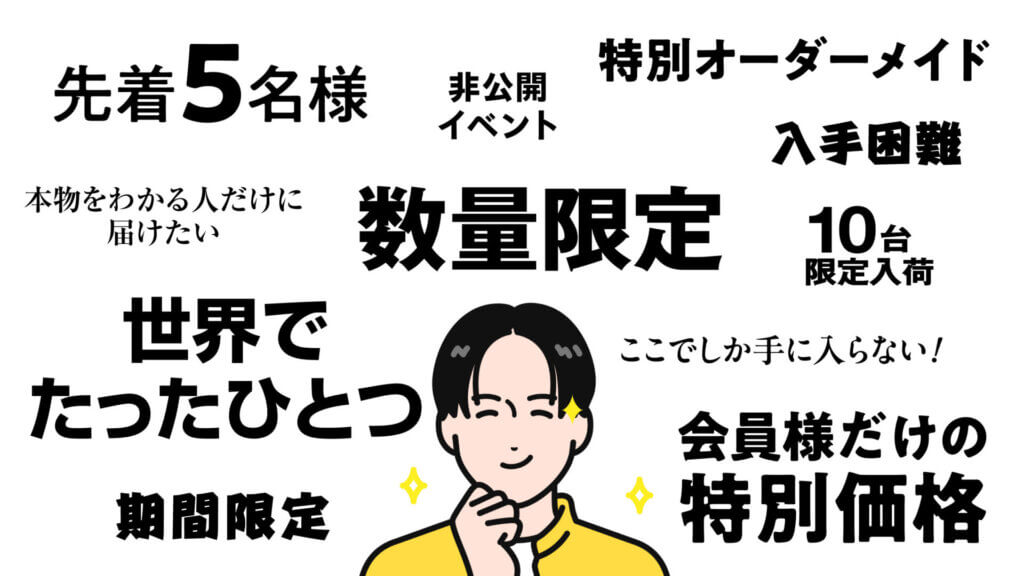 ビジネスシーンでは「地域限定」「期間限定」「1日10個限定」などの希少性訴求が代表例。手に入りにくいからこそ価値が増し、消費者の特別感をくすぐって購買を促しています。