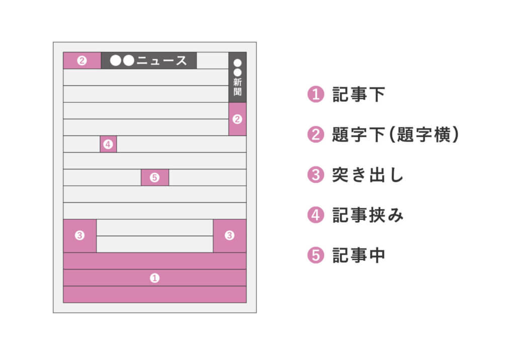 そんな新聞広告は、新聞の購読層である中高齢者をターゲットした広告だと効果的でしょう。また、新聞広告には「段」という概念があります。新聞記事は「段」によってブロッキングされて構成されています。紙面の縦を15分割するのが一般的で、1ページ全てを使用した広告だと「全15段」ということになります。使用する「段」が大きくなればなるほど値段も高くなります。新聞は広告欄が罫線で区別されており、線より下を「記事下広告」、線より上の記事の中にある広告を「雑報広告」と呼ばれます。掲載位置によって分類していくと、次のように細分化することができます。