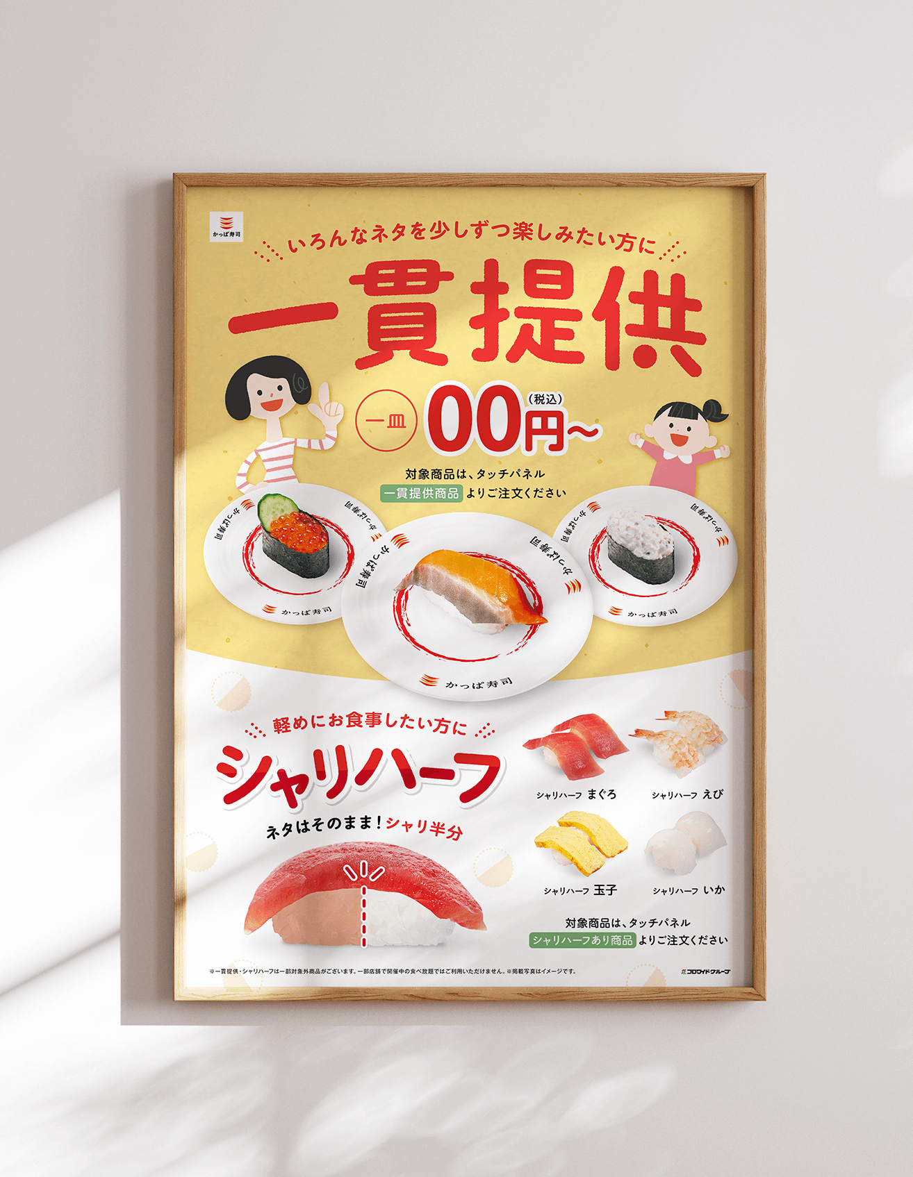 一貫から注文できる「一貫提供」とシャリが半分になった「シャリハーフ」の販促強化を目的とした、ポスターのリデザインのご相談をいただきました。