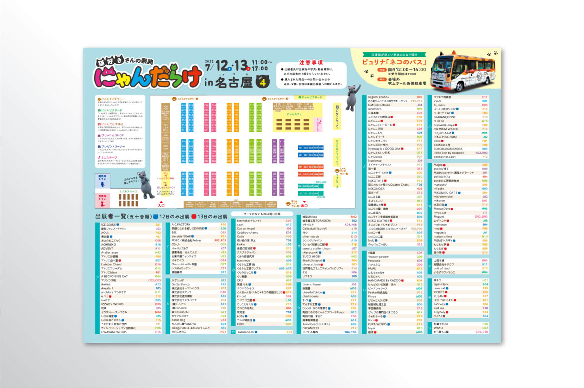 「にゃんだらけ」は猫に関するオリジナルグッズや、キャットフードなどの猫用品を販売しており、猫の生体は会場にいないイベントです。名古屋での初開催とのことのため、どのようなイベントかがわかりやすく、かつ楽しさや“猫愛”が伝わるよう意識しました。また、ブース規模を拡大しての開催&全国から出店者さんが集結するということで、規模感や多彩さが感じられるビジュアルにすることも求められました。